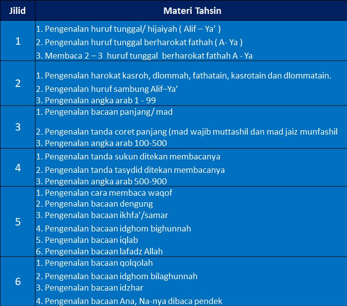 - Setiap kenaikan jilid melalui tes untuk memastikan kualitas hasil belajar jilid 1-9