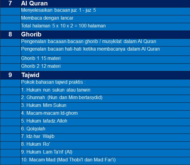 Pembelajaran Al-Quran mulai dari pengenalan huruf hijaiyah (Jilid 1) sampai pada teori tajwid secara praktis.
